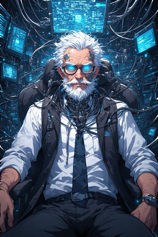 The forcefield shut down, and he was allowed in. He walked through the nearly alien environment that was like stepping into the heart of a computer. Men and women walked around, looking at monitors and interacting with it. In the back of the room, seated on a throne of tech, was a white-haired professor who was partially metallic and connected to the computer with cords and tubes.