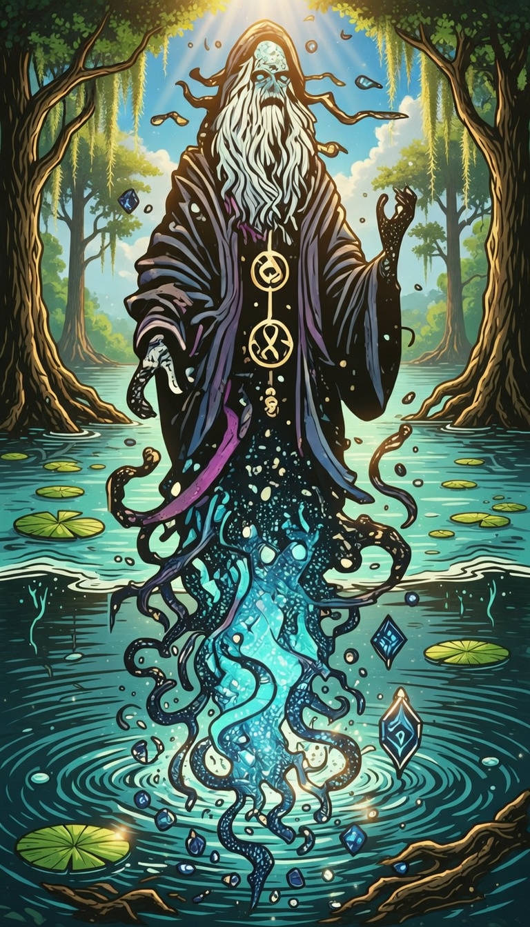 Wildshaper felt a great crash of water, and the impact threw him out of the tree. Springing up from the water was this creature. It still had its eyes on Algaea. She gathered green muck to herself to form a giant monster, but she was stopped. Energy came pouring out of her head, and she went limp.