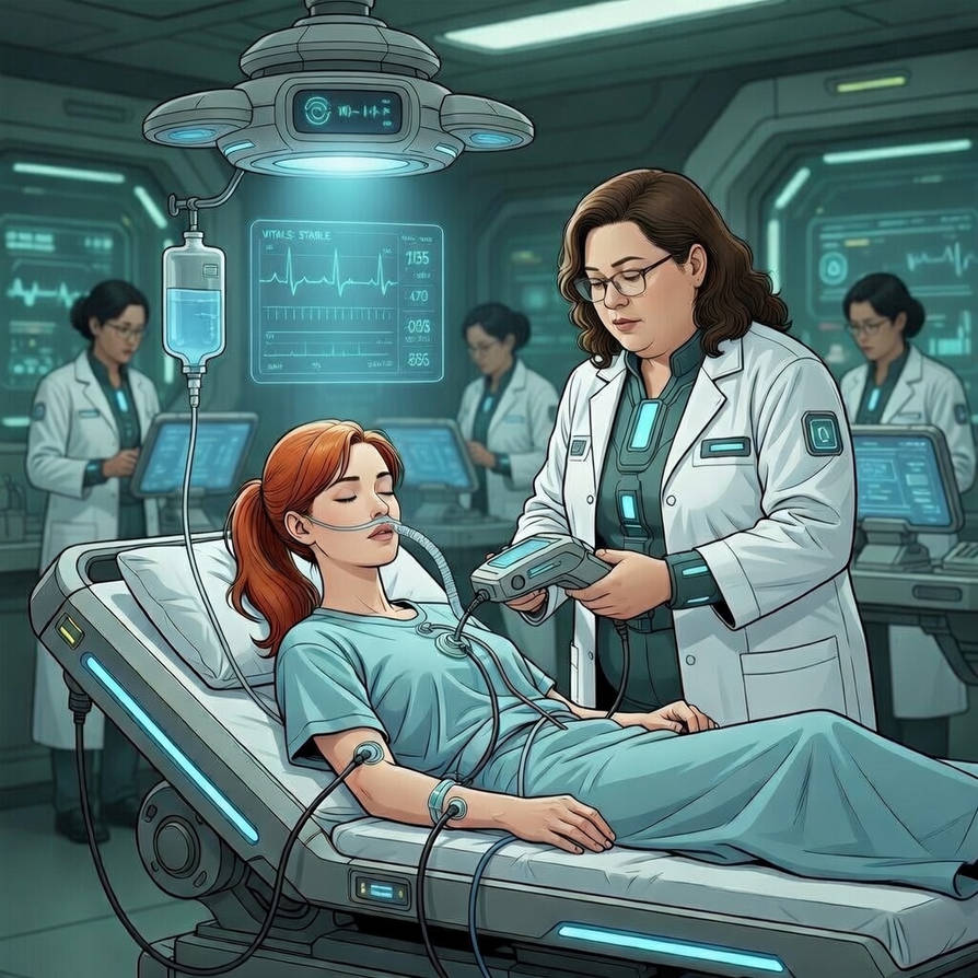 The door opened, and they walked in. Doctor Henderson leaned over a bio-bed with Dr. Fagan lying on it. Dr. Fagan was currently connected to medical devices, and several hovering scanners monitored her.“Report,” Nova announced himself with this one word.